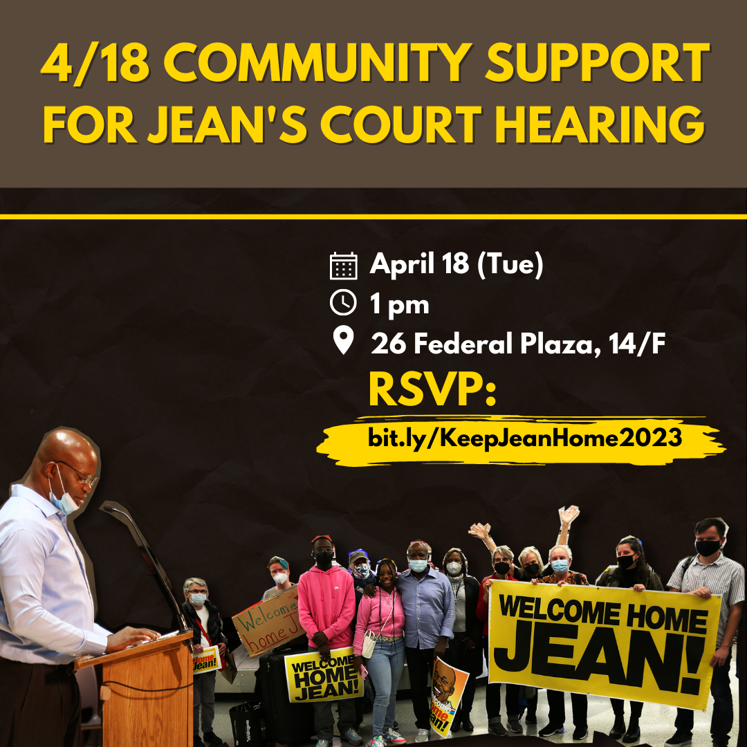Jean Montrevil’s individual hearing is on Tuesday, April 18, 2023 at 1pm at 26 Federal Plaza where Jean will give his testimony, this will be an opportunity to have witnesses testify and show support, and the judge will decide on Jean's application for 212(c) relief.
