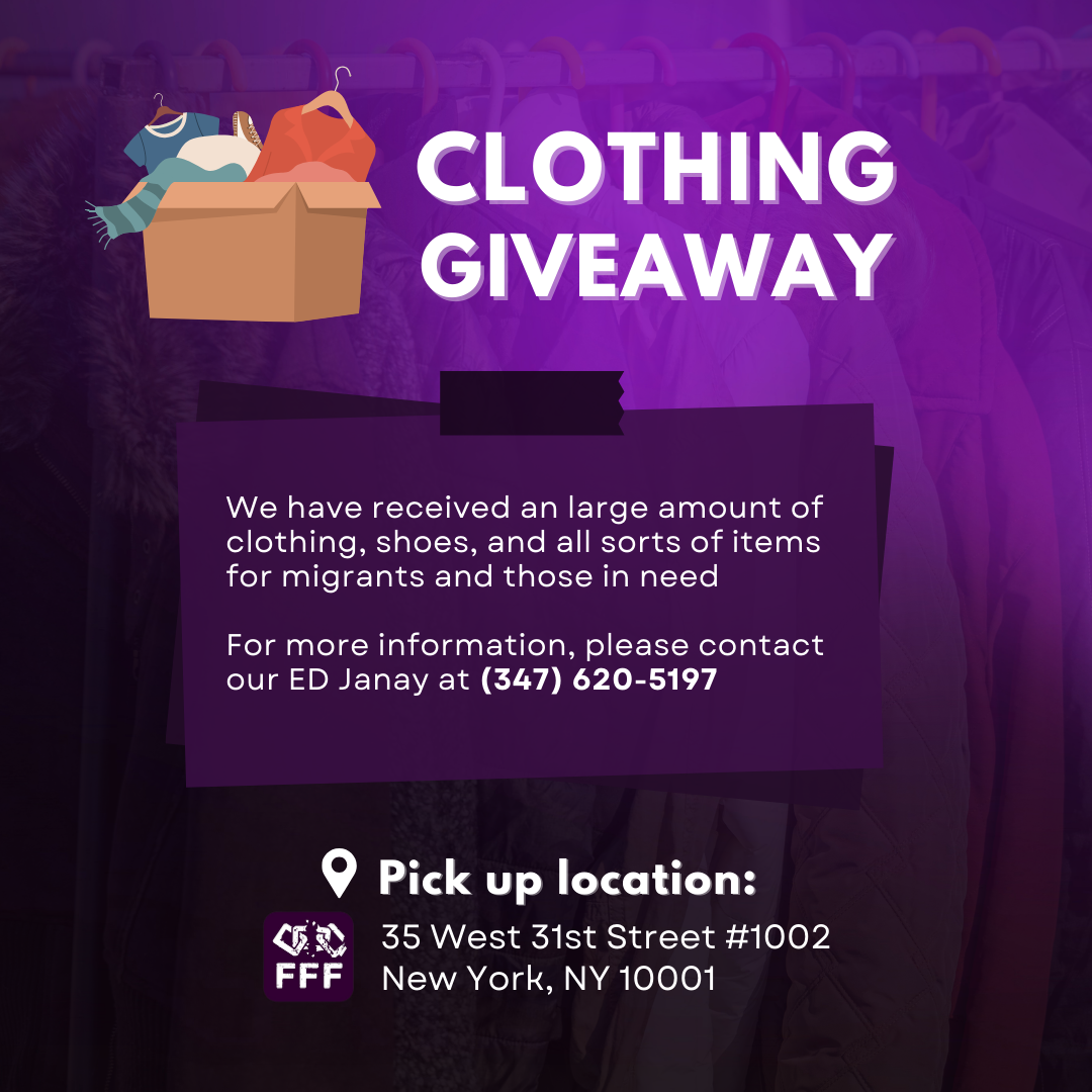 We have received an large amount of clothing, shoes, and all sorts of items for migrants and those in need, and is doing a giveaway at our midtown office.